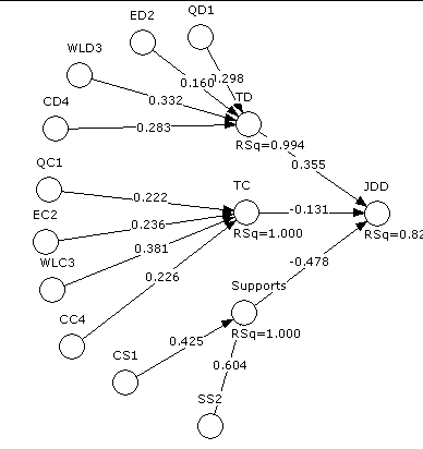 Table 1.1 & 1.2 show the zero-order correlations between the total job factors and job satisfaction outcomes. The three job factors variables were highly correlated (see tables) with job dissatisfaction. Job demands and its sub-scales, were high positively and significantly related to the expected job factors and job dissatisfaction, whilst job control and social supports emphasis were also negatively (and slightly less significant) related to job demands and job dissatisfaction. Furthermore, the relative magnitude of these bi-variate correlations was consistent with original predictions. High levels of all job satisfaction variables were associated with social supports, although the correlation between employees demands at T2 and job factors emphasis was slightly less significant. Tables above at T1 and at T2 show that the additive affects of job factors explained significant amount of the variances in job satisfaction variables. All factors were significant at the p < .001 level, with additive and quadratic effects contributing significantly to job satisfaction variables. However, our findings in job performance were strongly significant and consistent to job satisfaction variables. Specifically, there was a significant enhancing main effect for the demands, control and social support interaction in the basic model (p < .001), than that of additive effects. At both times, R 2 changes for job factors were remained significant at p < .001. Several points are noteworthy. Firstly, none of the main, additive and quadratic effects for various job factors were non-significant, Secondly, additive effects were highly significant than that of main effect alone, and thirdly, all findings were consistent except qualitative demands which were slightly decline. Several general points are noteworthy. Firstly, the specific job factors explained a significant proportion of the variance in the job dissatisfaction outcomes. Furthermore, the criterion of a reliable effect of employees' demands, qualitative control, total demands and social support were the highest predictors of dissatisfaction outcomes at both T1 and T2 study of regression analyses.