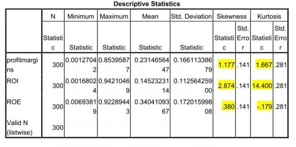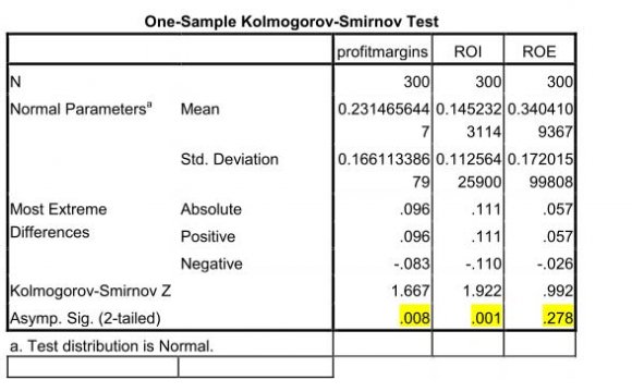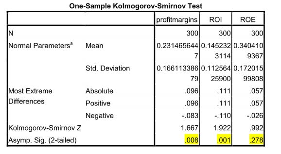 In the interpretation of the descriptives if the amount of this error is in the range of 2,-2, then the data distribution is normal. As it can be seen the investment return rate is not present in this range, so it is not normal.