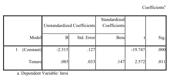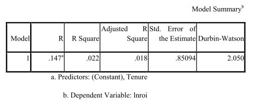 The amount of the adjusted coefficient is equal to 0.018 which suggests that the tenure period independent variable has been able to account for 1.8% of the variations of the dependent variable profit margin. Therefore, the rest of these variations (98.2%) are subjected to the effects of the variables exogenous to the model. T-value shows the relative importance of the presence of each of the independent variables in the model. To recognize which variables significantly and meaningfully influences the dependent variable we can look at tvalue. Usually, when the t numerical value modulus is bigger than 2.33 the error level will be lower than 0.05